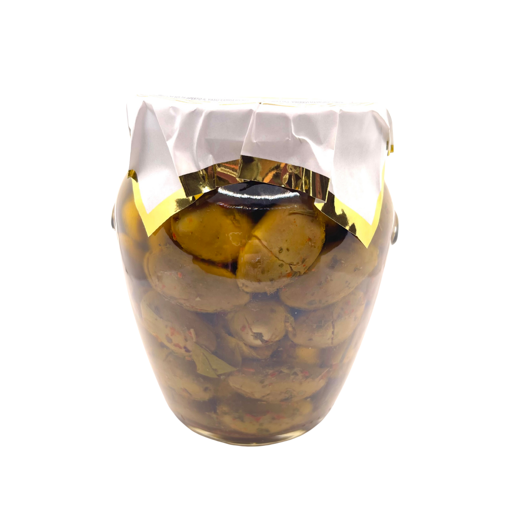 Vürtsikad marineeritud oliivid kiviga. Serveeri külmalt, lisa juustuvaagnale või naudi lihtsalt lusikaga purgist.